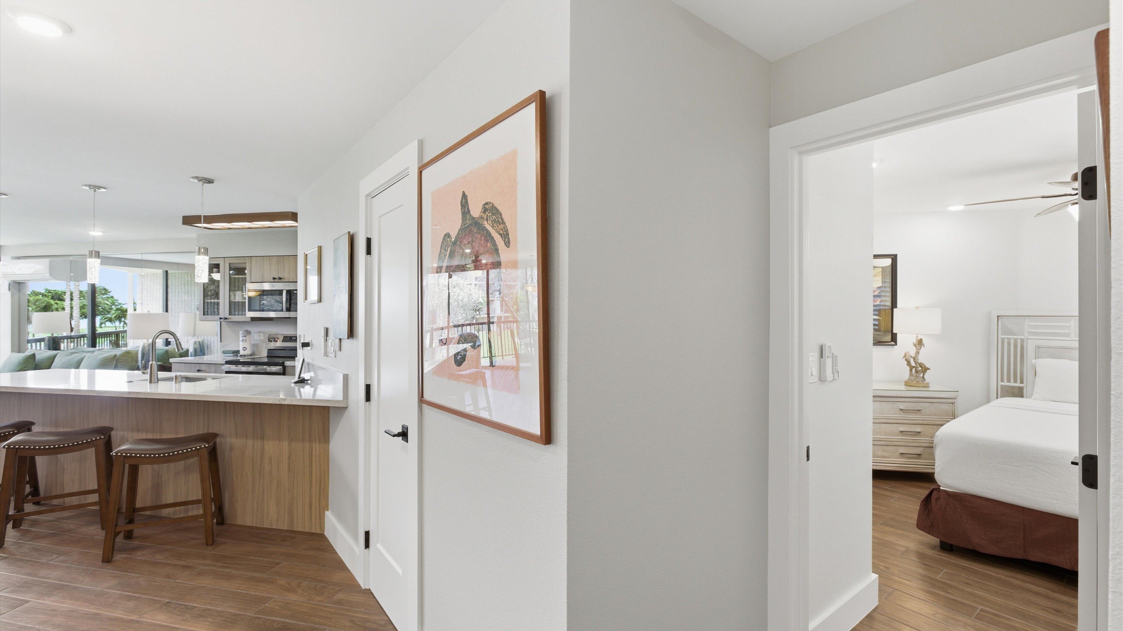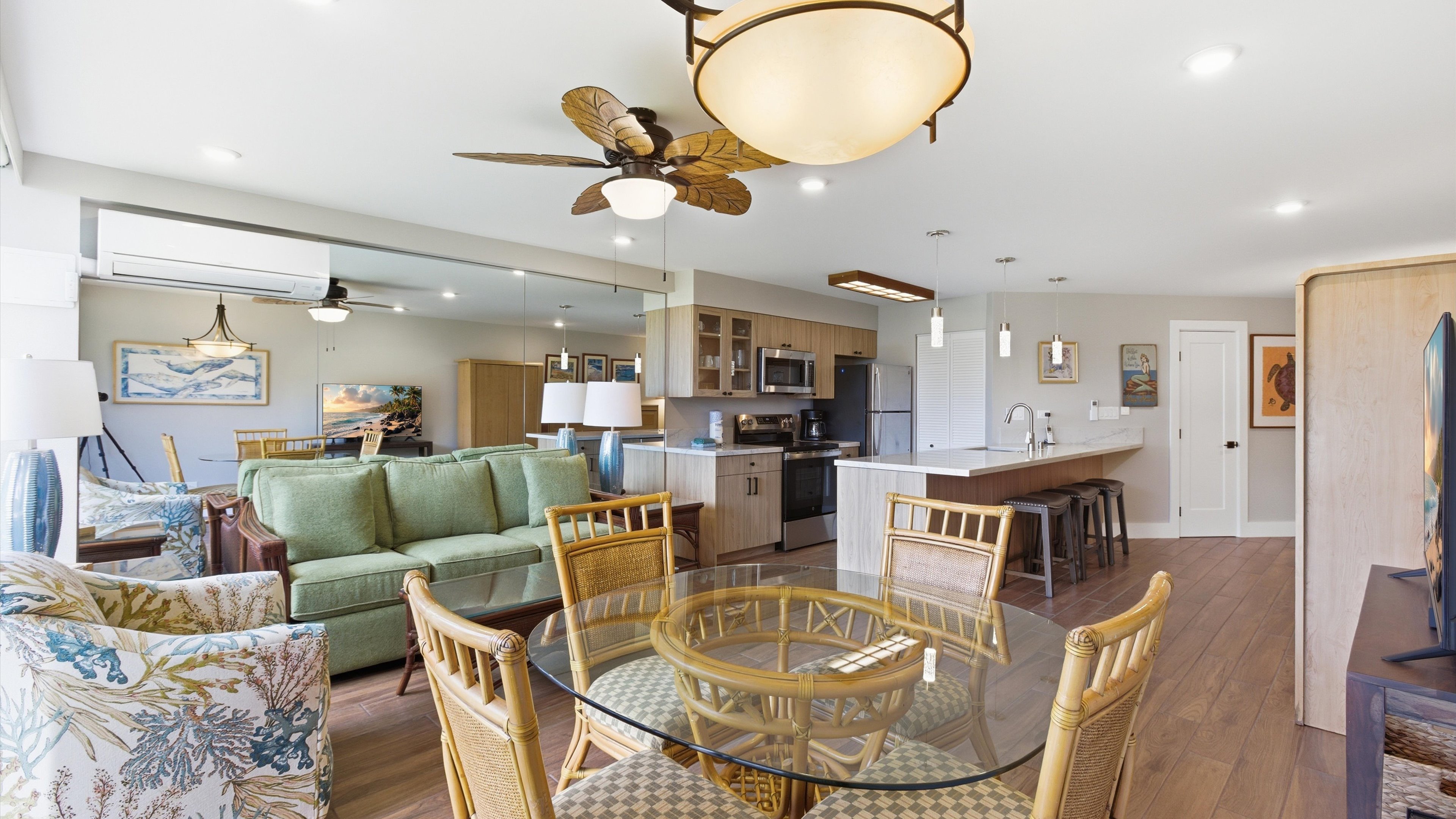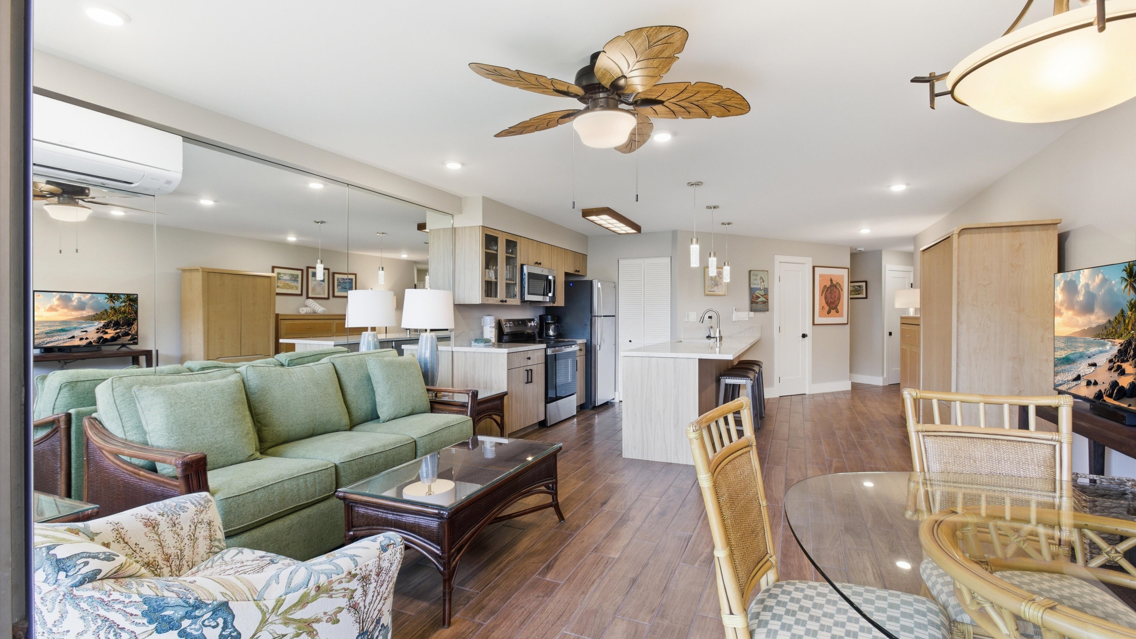 Large private condominium apartment at the resort condominium complex on the beach in sunny Kihei, Maui, Hawaii. One bedroom with private attached bathroom. 2nd bathroom down the hall with shower, large living area, dining area, kitchen with breakfast bar. Large private view deck looking out towards ocean. Beach chairs, beach/pool towels, full size appliances including air conditioning and washer dryer. Really, just hit the grocery store and you are set for the week!