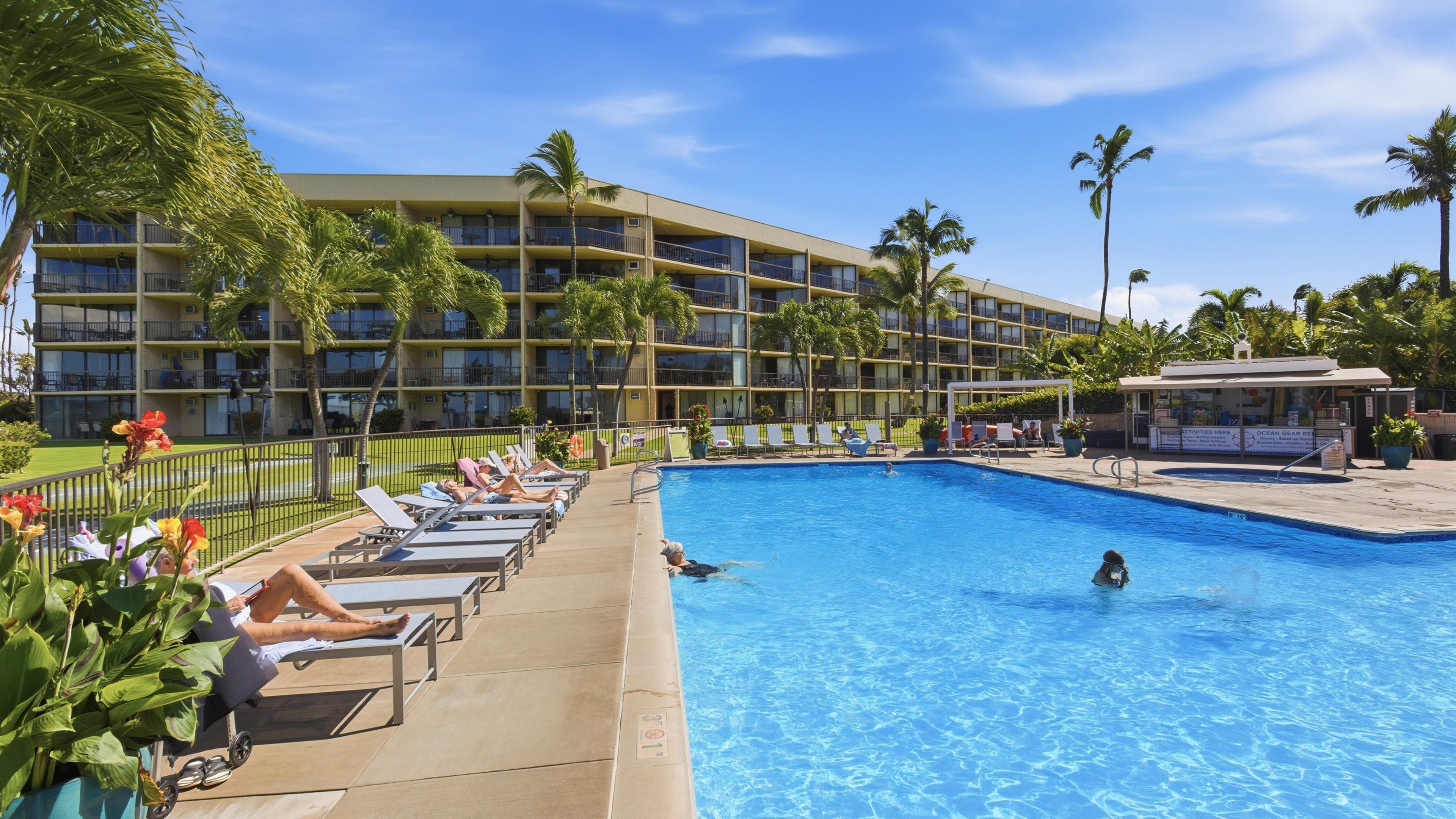 The Maui Sunset is located on over 5 acres of oceanfront at Kihei which is considered one of the best locations on the Valley Isle. Kihei is noted for its year-round sunshine, balmy trade winds, and soothing evening air. It is one of the driest and sunniest areas on the entire island, averaging only 10 inches a year! World famous swimming and snorkeling beaches are minutes away at one of the many sandy safe beaches at Kihei and nearby Wailea. Just a short distance (6 miles) from five championship 18-hole resort golf courses at Wailea and Makena. The two buildings frame and protect a large recreational area that is carefully attended and landscaped. The 60-foot swimming pool with its broad decks and abundance of pool furniture invites you to improve on your tan.